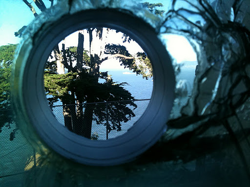 And then we came to San Francisco. I nearly died of fear when driving us to our hotel – driving up HUGE hills where you couldn’t see the top, and then down STEEP hills that were like a black ski slope. I do not know how you would do it with a stick shift We went up Coit Tower. We went to Alcatraz – the tour is really well done with an audio guide narrated by former prisoners and guards. This is a view from Alcatraz – you can see how thick the glass is:
