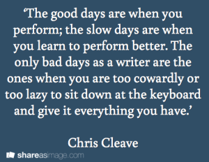 Tough love, but good advice from Chris Cleave. The whole thing is worth reading, find it here. This happened to me last week; I had no idea what to make happen in my story. I was (figuratively) poking my characters and saying ‘Do something!’ But I’ve been here before so I kept going, and eventually it began to improve and now I think it’s going to be one of my favourite stories.